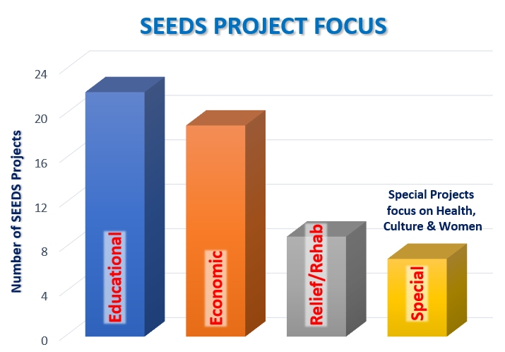 Interestingly, because of the experimental and catalytic nature of support that SEEDS provides, the kind of projects funded varies from year to year showing spontaneity, flexibility, and adaptation to the needs. It is also difficult to label projects under a single category as a single project may have multiple focus, such as economic growth and empowerment training for women, or health education, or cultural art education, or income generation and food security after natural disasters.